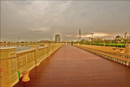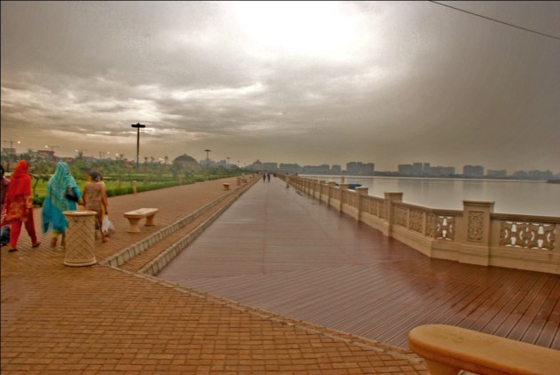 I went to newly inaugurated Boat Basin Creek Park (Shaheed Benazir park if it makes any difference to her) to celebrate the change in our fortunes. Clifton has become a block of lush green parks and severely broken roads. The moment you enter the park off a bumpy road, you realize that it is different, it is expensively built. There is at least 3 km wooden jogging track, a floating bridge, a restaurant under construction, imported plants and stunning canopies. There were smiles, balloons, colors and, and stinking smell.
