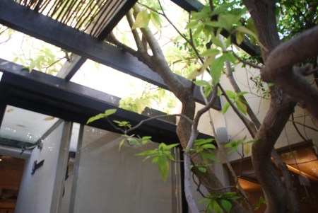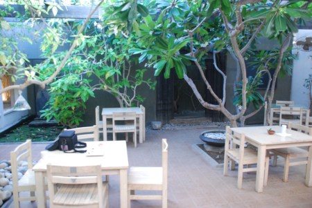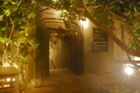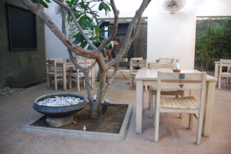 The place is pleasantly adorned with champa plants and evocative woodwork. Don’t sit inside in the Air-conditioned room. It is boring. Sit outside in the courtyard and immerse into the ambiance.