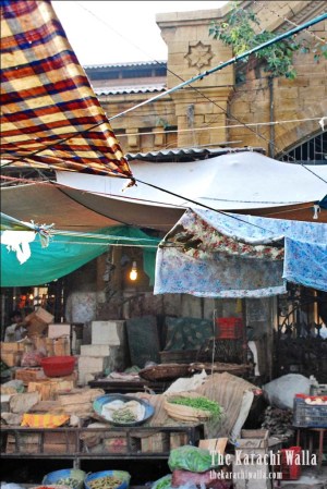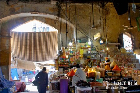 The building’s magnificence has been marginalized by poster mafia who have put countless posters across the front wall. At the front gate a plaque confirms that building was commissioned in 1889 and been renamed as K.M.C Market. Below the plaque someone has sprayed a warning message for skeptics that he would stand next to Zardari in times of peace and war. Why has he chosen a heritage site for the warning message is unknown? The building is constructed around a courtyard which houses many small shopkeepers. Most of the shops don’t have demarcated boundaries and goods are put under make shift shade. Even at eight o clock you will find shopkeepers unpacking their stuff and greeting customers. Walk straight and you will end up in the sabzi market. Turn right and you will be heading to infamous rainbow center. Turn left and you will find a bazaar full of spices.