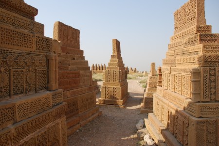 Royal and Elegant but Ignored by Karachi Wallas. Chowkandi tombs are a masterpiece of craftsmanship but hardly given due respect by its countrymen. On the left of utterly commercialized N-5 (while heading to thatta) it is marked by a small signboard. FAST-NU building on the right serves as a better landmark. It takes half an hour from Airport to reach there. Ugly commercialization has ruined the area while Chowkandi remains an instant getaway from the obnoxious urban development around. Enter the gate and landscape changes drastically. Greasy landscape of the highway disappears and is replaced by an art lover’s paradise.