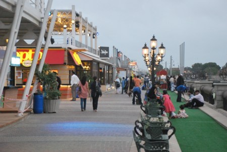 Drive to the famous Native Jetty bridge. On M.T. Khan road, take a left before climbing the bridge. Head to the Beach Luxury and turn right on a narrow alley which will lead you to the footsteps of the bridge. You will find Valet Parking here. Move inside. Take a moment to look at the bottom of Native Jetty Bridge. Black mossy water has taken its toll on the pillars. One or two kids will be swimming in this fatally polluted water. A narrow street along the road is leading to the Mandir. Besides the street a huge iron gate is the entrance of the huge Port Grand. Right at the gate you could have a look at the art gallery which is not opened yet. It looks promising. Enter the gates after paying entry fees and you will be facing Port Grand’s main facade which houses many brands. Only few front shops are open. Turn to the right and you will be heading to the Theatre and other stuff which is not open yet. Turn to left and you will be heading to the food street. Walk the promenade and you cant help notice a majestic old tree which has seen good and bad for long. A very nice looking and inviting restaurant is next. Take a moment to absorb the view. The old railway track heading to KPT invites you to follow it. In distance you could see huge ships getting ready for upcoming journey. On the left a line of restaurant goes as long as one km.