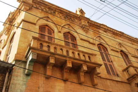 Max Denso hall was built in the honor of Max Denso who chaired Karachi Chamber of Commerce from 1870-71. The Municipality allocated the site on Bunder road and provided additional funds. James Strachan, who else, was the architect and the project was completed in 1886. The building included a library and a reading room on the ground floor and a hall on first floor. Local Gizri Sandstone was used in its construction. The main road facing side has projected balconies with carved balusters. There is a clock on the top of the side facing Jehangir Kothari building.