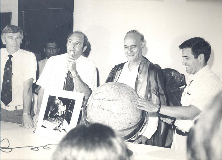 The astronauts present an autographed model of the moon to the students of Karachi University, as the Vice Chancellor Hussain looks on.