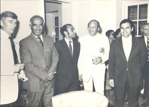 At a dinner hosted by Charge Sober, left to right, are Captain Cernan; Sayed Ghulam Mustafa Shah, Vice Chancellor of the University of Sindh; Syed Qaim Ali Shah, acting Chief Minister of Sind Province, Captain Evans; Dr. Schmitt and Mr. Sober.At a dinner hosted by Charge Sober, left to right, are Captain Cernan; Sayed Ghulam Mustafa Shah, Vice Chancellor of the University of Sindh; Syed Qaim Ali Shah, acting Chief Minister of Sind Province, Captain Evans; Dr. Schmitt and Mr. Sober.