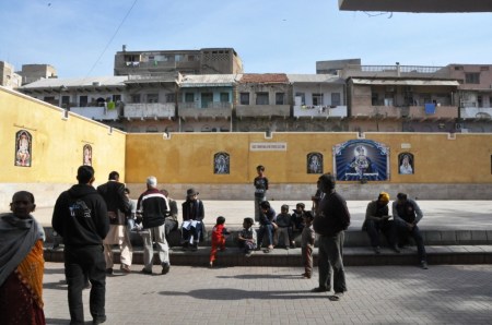 The compound accommodates a Sikh Gurdwara as well. There is a sacred cowshed at the back and a gate which leads to a neighborhood with those fabulous balconies from yore. It is the biggest temple in Karachi and naturally a center of celebrations during dewali, holi and other festivals. There’s a significant hindu population living around the temple. On a rare cold morning, a lot of families from neighborhood were basking the sunlight in open compound. Few children were playing cricket. Another was walking a poodle from one end to another. KMC building made the backdrop. It was beautiful.