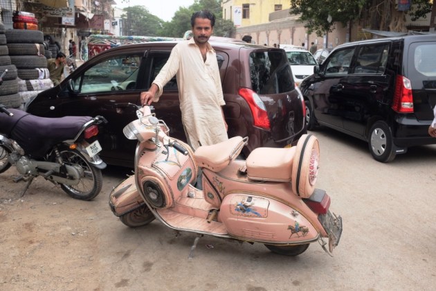 You are here: Home » City Shopping – Vroom! Into the graveyard of Vespas we rode… » 8 – Shehzad poses with his pink 83 model Vespa