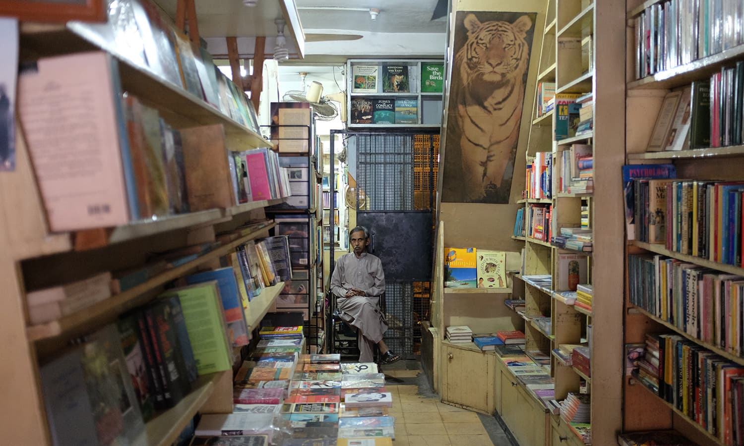 Now, a lone ceiling fan slowly whirs away, and only a couple of tube lights illuminate the store. Some shelves at the back remain vacant due to water leakage; the books however, remain neatly stacked for display, almost untouched.