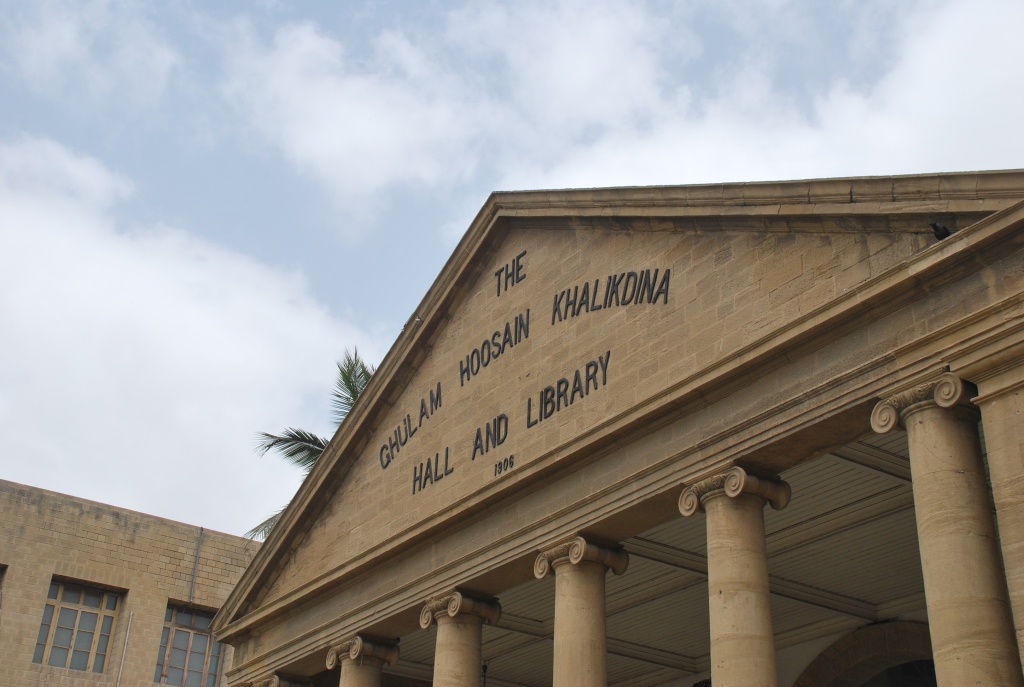 You are here: Home » City Walk – 12 stops: A Do-It-Yourself tour of Karachi » 10 – With its unique setting of pillars and pediment Khliad deena hall catches your eye from a distance