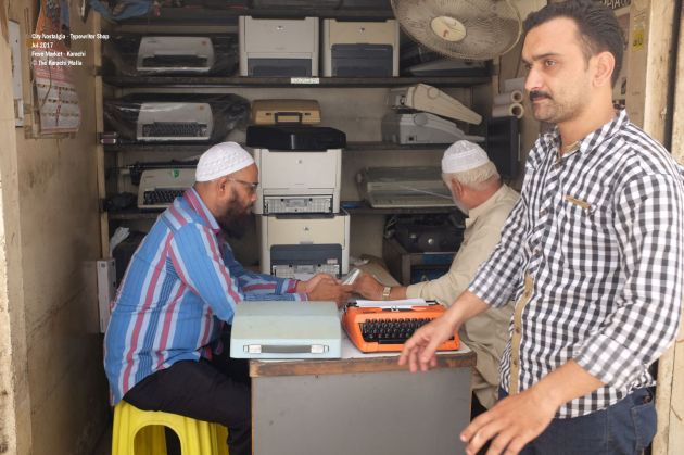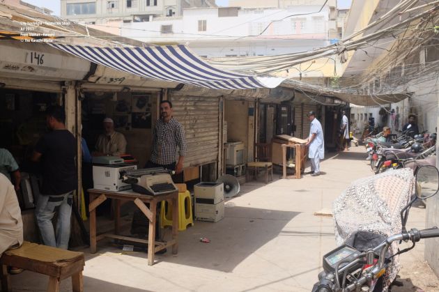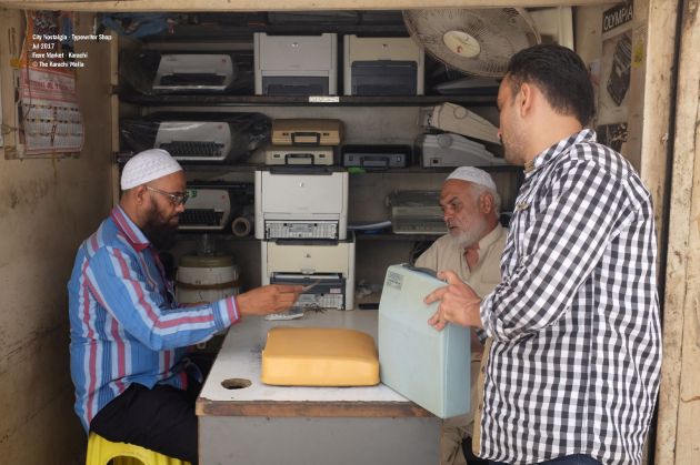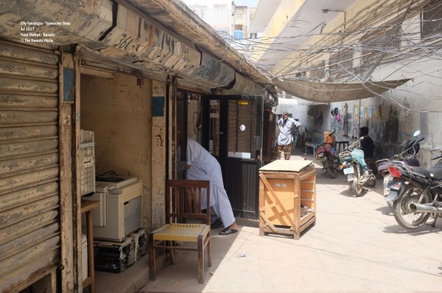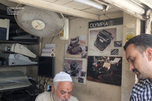 At first sight, ‘Fine Office Machine’ does not look very different from other regular shops in Frere Market. The tiny shop must be smaller than a rest room in an average house in Karachi. There are three people sitting inside. One of them is Bahroze, the founder of the shop and a veteran technician of typewriters. Javaid, one of the other two is his son and helps his father in running the shop.