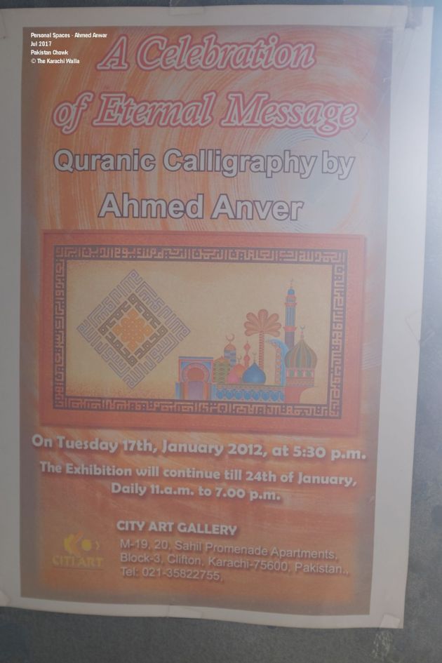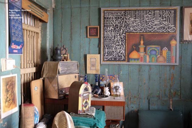He offers me tea and I light up a cigarette. He expects me to ask questions about his art. He made his name in calligraphy which adorns his walls. Minaret and domes feature in his work intermittently. His color palettes is bold. You cannot ignore it. I ask him instead about his collectibles which are put against a blue colored wooden wall. He tells me that he has been collecting them all along. He is a practical man. He has been selling them whenever he receives a good offer. A bohri gentleman, who is Ahmed Anver’s neighbor joins us. We talk about the Karachi, its flea markets, its appeal to the migrants, the opportunities and disappointments that it bestows upon its denizens.