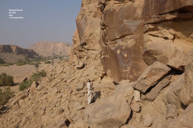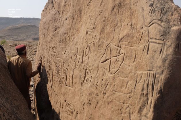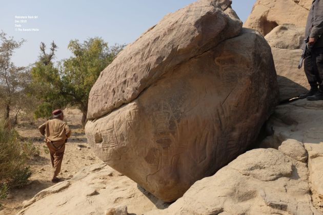 Miskeen Laghari, my guide from earlier trip took us to Malango Jabal and Salari, two areas with most number of rock art sites around Gaj Nadi. The rocky road which connected both areas was carved out by an oil drilling company. While it made both areas accessible it also posed great risks to the site as more visitors have gotten access to these sites and have deformed some already. Proximity to oil drilling sites could pose threat to these sites also as Rocks have fallen off in layers at few sites.
