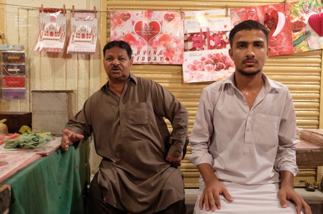 Javed orders for tea which never materializes. He tells me that the most expensive Eid-Card in his inventory is for Rs. 250. The median price is Rs. 100. The cards are flashy, red and have some sort of 3d feature. A kid is helping him run the shop. He tells me that he is son of the owner of business he works for. I ask them for a photo. They sit next to each other, Javed laughing as his disciples holds breath till I click the camera.
