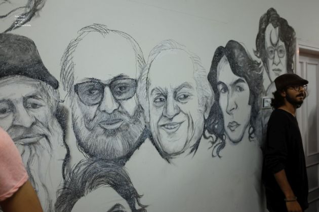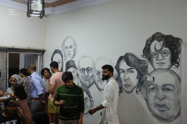 The thing about stepping out of one’s neck of the woods is that you get to see new faces and I was very much looking to see and meet new people. Someone greeted us and showed us the directions to the event hall. There were people and lots of people, most of them in their mid twenties. We could not find space in the event hall so we loitered around for a bit in what looked like TV lounge as per the original layout. There were portraits of important historic figures most probably painted by Feica who happens to be on the advisory board of cafe also. More people poured in which pushed us back to the event hall and we luckily found space this time. At that moment, ever so brilliant Fawad Khan – Dastan go and theater actor – was performing Ismat Chughtai’s Amar bail. I was listening to him after a while. He was good. He has gotten better. The story telling session was followed by poetry recital and there were some powerful performances. Attiya Dawood, Ali Arqam, Waheed Noor, Shane Hussain, Neel Ahmed and Zulfiqar Mannan recited their pieces with some also choosing to read intikhaab from great Urdu poet’s works. I could see Arieb Azhar in distance. He was set to perform after the poetry recitals.