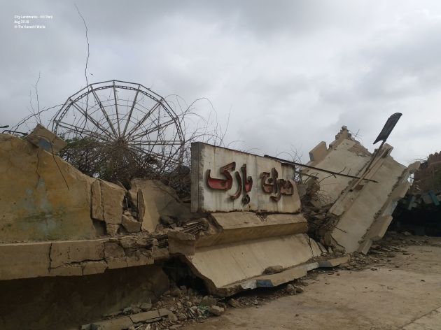 Karachi is at the footsteps of Kirthar range which meets Arabian Sea at Cape Monze. Karachi’s landscape would not have been different from other areas around the range had it not benefited from fresh water supply from Keenjar lake and Hub river. Water makes the difference. The essential ingredient for sustaining life. There was no water in the small lake inside Hill Park when I went there last. The flock of ducks in the lake, which is one of the biggest attraction for kids were restricted to a small filthy basin with little water and a lot of garbage, shopping bags. There were more men. Sitting in groups on benches in Shalwar Kameez doing nothing in particular. I could see more garbage in distance in front of the cafes. It appeared that all disposables plates and glasses were thrown right in front of the food stalls. We moved forward and reached abandoned Mairaj Park. You would perhaps remember it from your childhood. A new amusement park on the far end of Park has replaced Mairaj Park. I could see old rides and rusting billboards but there was no way in. The entry has been blocked on purpose with debris. I saw a door which was locked and some men inside the compund. We decided not to explore the possibility of going in.