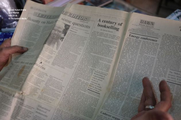 He takes a break in middle to answer a phone call which is an inquiry about an old edition. There is an old copy of Dawn lying on his desk in which senior journalist Zubaida Mustafa has done a feature on the bookstore.