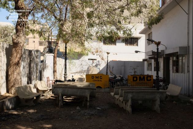 There are two foundation stones at the entrance of the library. The library was inaugurated as ‘Baldia Karachi central library Nazimabad 5’ in 1988 and later it was renovated as ‘Jigar Muradabadi Library’ in 1997. The original design of the library is compact but aesthetically pleasing with one hall and a librarian room on ground floor and two small rooms on 1st floor for accommodating books. There are benches, lamps and several neem trees outside and it looks like that it must have been a beautiful setting when the library was inaugurated. However years of negligence gives library a desolate condition now. Benches, lamps and windows are broken and looks like that the library has not received any kind of books in a long time. Library is still open to public thanks to a librarian who manages it. We don’t find him there during our visit but I can imagine his limitations. Libraries are slowly becoming irrelevant and the whole proposition needs to be rethink-ed and re-branded. It is sort of a chicken and egg situation. Investment will come only if people take interest and people will take interest only if library is good enough. Libraries such as Jigar Muradadbad still can offer a lot to the community. Their biggest asset is the space which is becoming more valuable everyday as residential spaces around them become more congested. With more ownership and public-private partnership, these libraries can become a great communal space. Something worthy of being dedicated to a great Urdu poet.