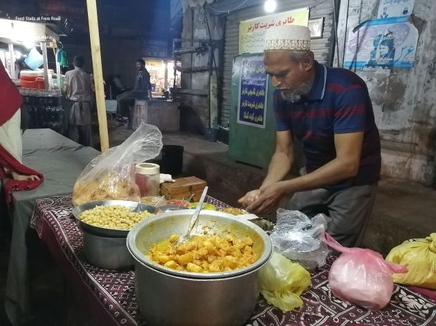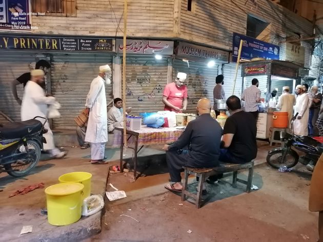 We get dropped at Pakistan Chowk and walk along Outram road towards Haqqani Chowk at around nine o clock. Outram road is a visual treat from Pakistan Chowk end. Several stone buildings provide an exquisite backdrop to post Iftar frenzy. During Ramazan, the transaction time reduces and you see a lot of people going out for shopping and running errands post Iftar. Almost every shop, no matter selling what, has a queue of customers. Especially the ones selling food. We cross some chai khanas packed to maximum with groups sipping tea and chatting. We cross a lot of women, in numbers that one does not see during rest of the year.
