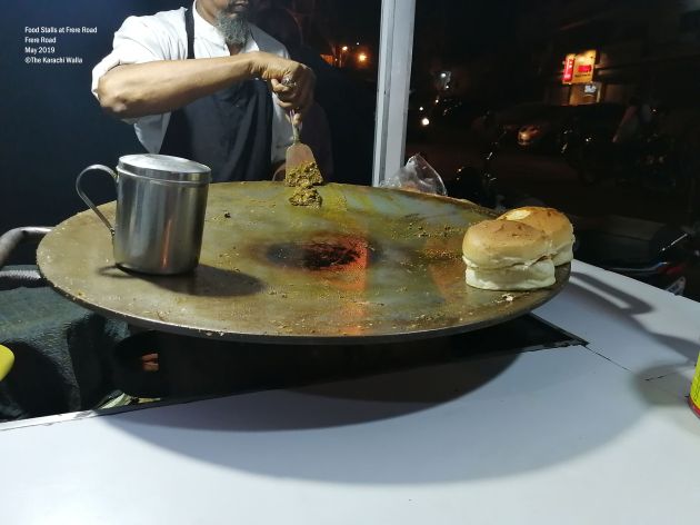 There are eight to ten stalls depending on the day you visit the informal setup. Most of them are run by Bohri gentlemen from the neighborhood. The stalls are small with one or two stoves. Kaleji with Bun Kebab is the popular choice and there are three food stalls serving it. All three have different variations and our favorite is one with harra masala. The plate costs 120 rupees. There are several chat wallas with different variations of potato centered recipe. However we find it quite ordinary, except for one gentlemen whose khattay aalo has right amount of spice mix. It costs between 40 to 50 rupees for one serving. Sadly not much of authentic Bohri food is on the menu therefore we get excited when we find Malpura on one of the stalls. Fried deep in a karhai full of oil, it is little too sweet for our liking. The highlight of the street is a stall offering Limca soda which is very refreshing for current weather. The stall is managed by a kid and has about a dozen flavors to offer. There are some traditional choices such as Haleem, Pasta and chicken corn soup. The place is popular with people from neighborhood and otherwise. Within half an hour we see a lot of bikes and cars stopping and people circling the stalls.