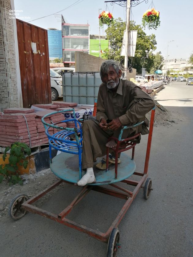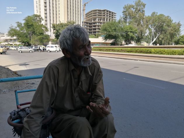 He lives in Lyari but pushes his roundabout everyday all the way from Lyari to Frere Hall. His name is Suleiman.