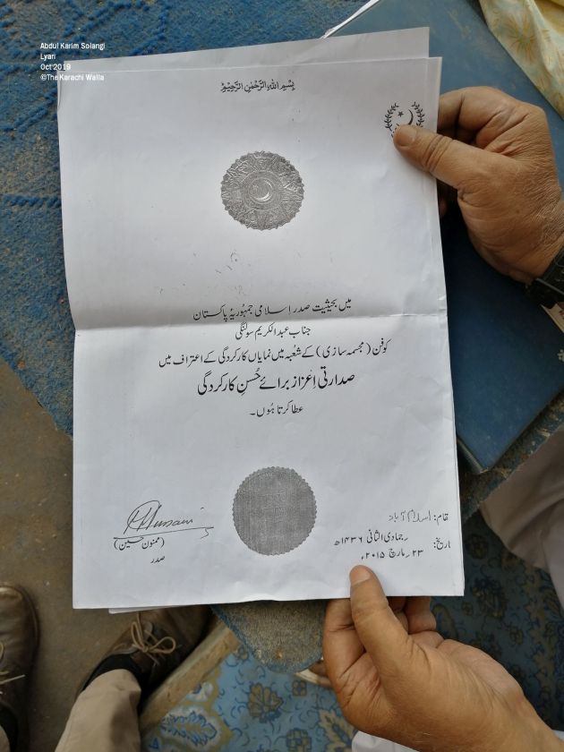 I join Solangi at the front of the shop. He has many things to say. Every sculpture has a story behind it. Arranging miniature clothes, instruments, accessories etc has been a project in itself but Solangi remained steadfast. His work has been well received and he started getting invites to participate in cultural events organized by cultural ministry and Arts council in Karachi. In addition he has been participating voluntarily at cultural events such as Lyari Literature Festival. In 2015, Solangi was awarded Pride of Performance by Mamnoon Hussain, then President of the country. The award has not changed his fortune much though. He continues to get odd invites here and there but there has not been any support to help him create new work or teach kids his skill. He has not been regular to his museum recently but whenever he opens it, people in the neighborhood know. He has spend most of his life around this neighborhood and people stop by to exchange greetings.