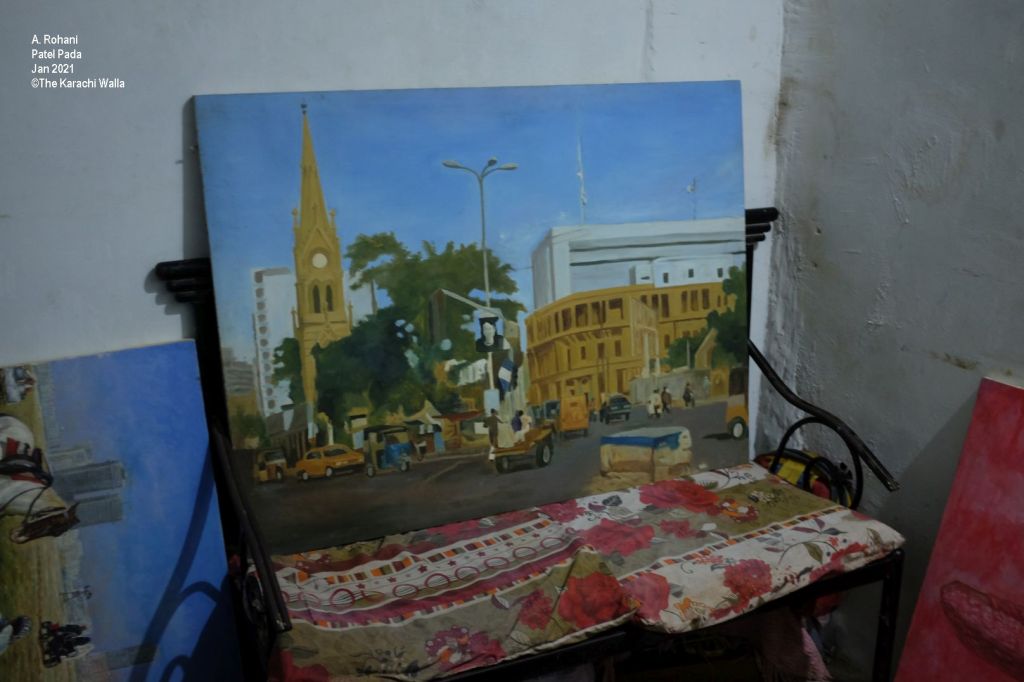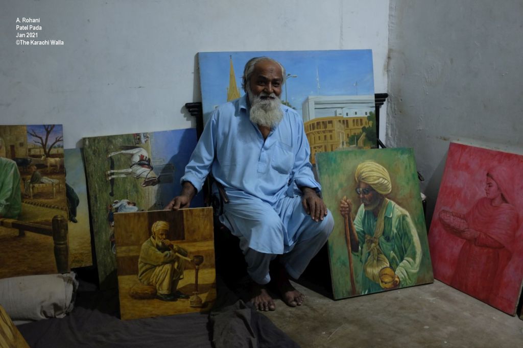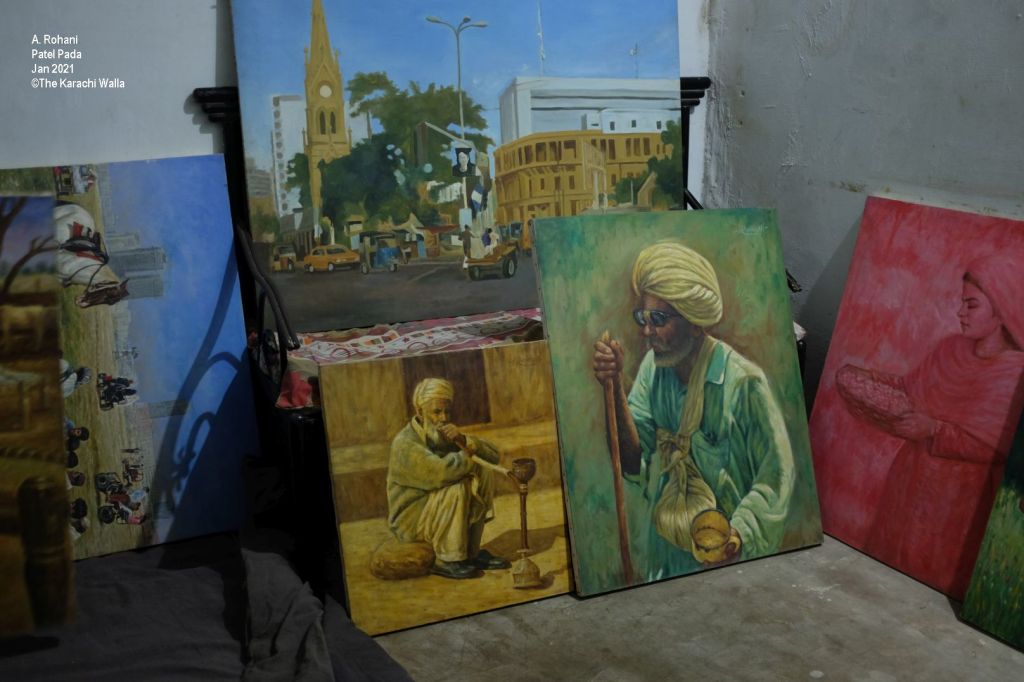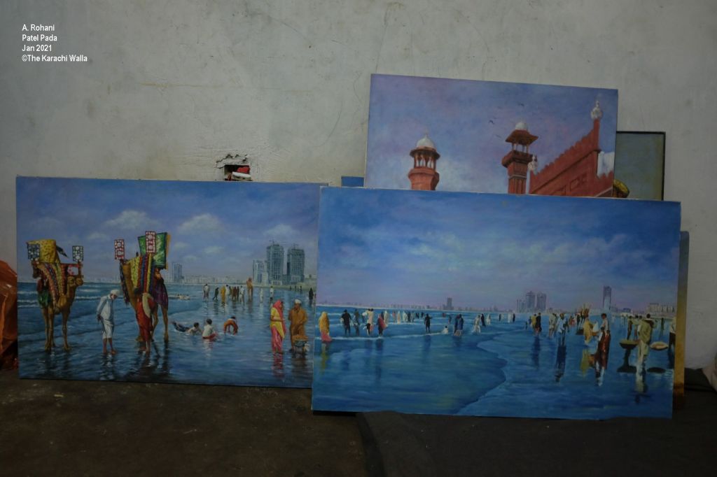 Rohani sb mostly created realist paintings of rural setting featuring villagers in their daily settings, with mud cottages making the backdrop. I kept running into his work at some of the galleries but could only met him once before. Few months back I happened to be in Patel Pada – where he lived – and luckily was available at his home. We met under the recently built bridge for Green Line Bus Rapid Transit (BRT) system which cut through Business Recorder Road for some length at a great height. It hasn’t been commissioned yet. Rohani sb was dressed in blue shalwar kameez and had a warm smile. He led us to a street off the main road and we reached his small home after a brief walk. We followed him to the first floor which has been serving as his studio. In the two tiny rooms we found more than a dozen semi-finished/finished works. Over the years he has started documenting more urban settings but has brought his typical touch to them. More familiar settings such as Seaview, II Chundrigar road and Kothari Parade features in his work now. From families having picnic at Seaview to labour working at Kothari Parade, rohani sb’s work often features simple settings which you often pass by without noticing. It was his gift that he could see beauty in those moments. It was his gift that he could transfer those moments to the canvas.