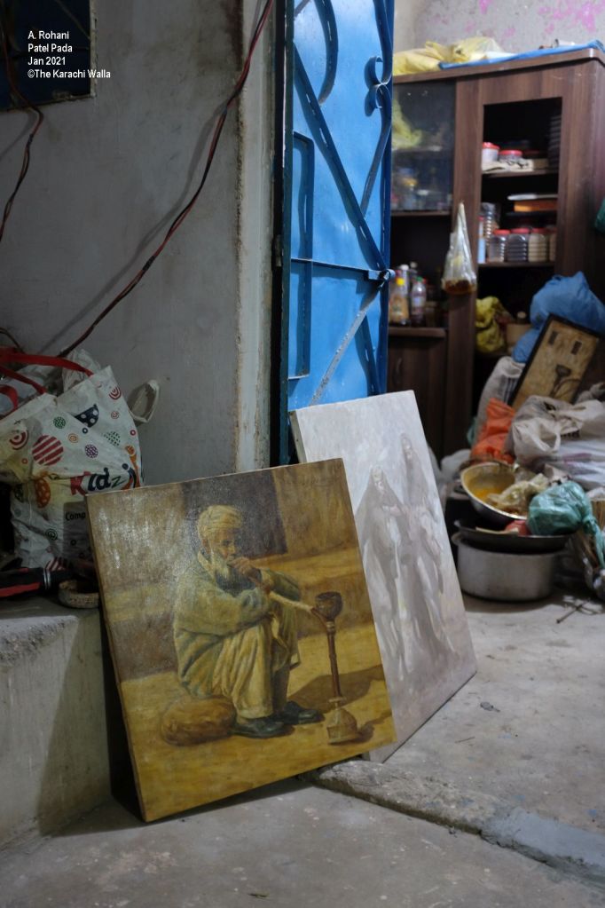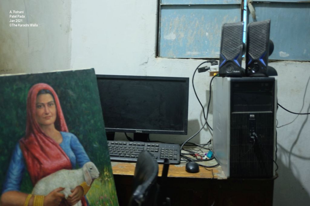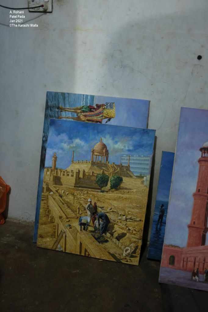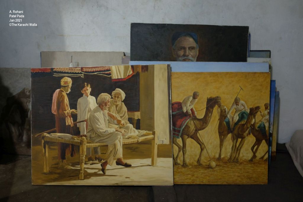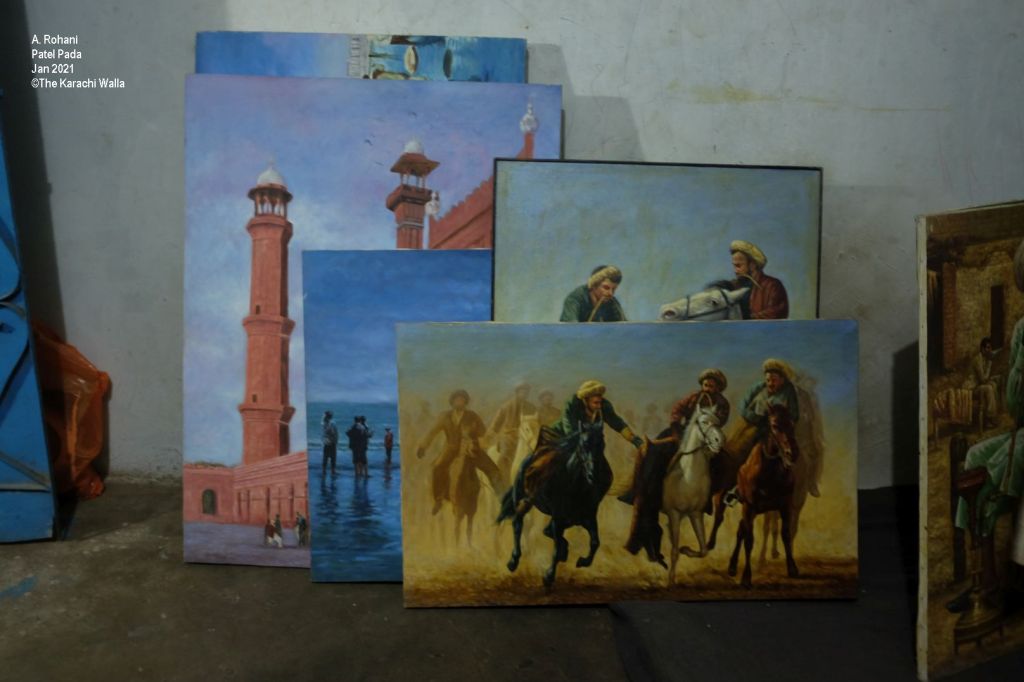 Rohani sb mostly created realist paintings of rural setting featuring villagers in their daily settings, with mud cottages making the backdrop. I kept running into his work at some of the galleries but could only met him once before. Few months back I happened to be in Patel Pada – where he lived – and luckily was available at his home. We met under the recently built bridge for Green Line Bus Rapid Transit (BRT) system which cut through Business Recorder Road for some length at a great height. It hasn’t been commissioned yet. Rohani sb was dressed in blue shalwar kameez and had a warm smile. He led us to a street off the main road and we reached his small home after a brief walk. We followed him to the first floor which has been serving as his studio. In the two tiny rooms we found more than a dozen semi-finished/finished works. Over the years he has started documenting more urban settings but has brought his typical touch to them. More familiar settings such as Seaview, II Chundrigar road and Kothari Parade features in his work now. From families having picnic at Seaview to labour working at Kothari Parade, rohani sb’s work often features simple settings which you often pass by without noticing. It was his gift that he could see beauty in those moments. It was his gift that he could transfer those moments to the canvas.