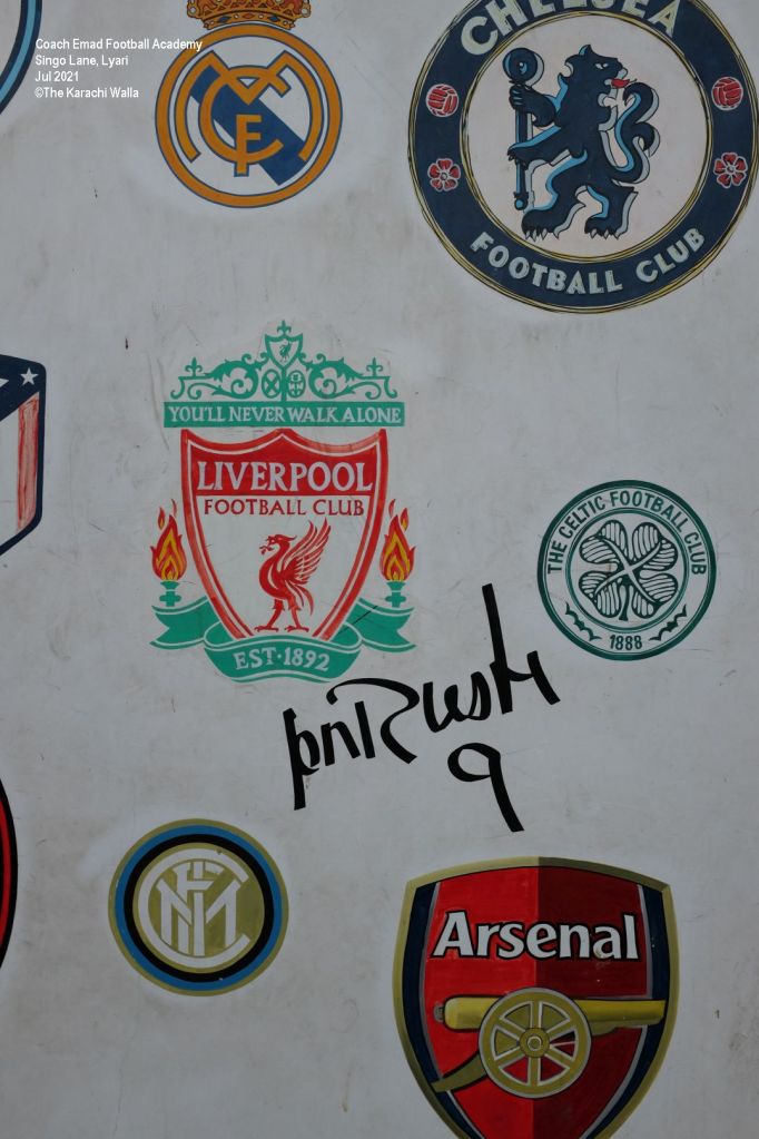 The field is divided in two parts for the day. The younger kids are participating in a training session while senior kids are playing a practice match in the other half. They also have a serious audience watching and applauding their every move. We walk around the field. Footballers from Lyari has always found inspiration from Brazilian footballers but I sense the younger generation has found new heroes with a lot of kids wearing jerseys of their favorite footballers from European leagues. On a wall I see logos of a lot of clubs painted. Close to Liverpool club’s logo, I see Ian Rush’s initials. Curiously, I ask Waseem about it and he confirms that Ian Rush had visited this very field a year or two back! Ian Rush is one of the greatest forwards of his time and a Liverpool legend.